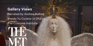 A metal swinging pendulum traced patterns in the sandy runway of the Gucci Fall Winter 2020 Men’s show. Circling around it, 58 looks from the men’s collection debuted, including distressed cropped knits, wide denim pants and prints by Liberty London. T-shirt artworks from “Psychopts”, a book by Richard Hell and Christopher Wool.
