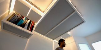 The interior footprint is small, relative to conventional Swiss homes, but it feels larger thanks to an indoor/outdoor space enclosed in wood framing, translucent plastic and a mechanically-movable screen. The interior was built in prefab wood panels, supported by one centered concrete wall which serves to anchor the open floor plan.